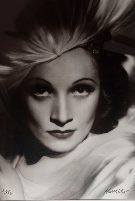 Framed studio portrait of Marlene Dietrich, actress – an exceptionally large image. An authentic, iconic full-face glamour photograph by George Hurrell circa 1930 (printed later). Gelatin silver print is an authentic image by the photographer. George Hurrell. Signed on the lower right and numbered 23/50 on the lower left. George Hurrell was an American photographer best known for his portraits of Hollywood movie stars such as Joan Crawford and Marlene Dietrich. Hurrell?s style of lighting and composition enhanced the glamour associated with Hollywood during the 1930s. Born on June 1, 1904 in Covington, KY, he grew up in Cincinnati, OH, developing an interest in painting and photography as a child. Hurrell went on to study at the Art Institute of Chicago, and initially used photography as a way to document his paintings. While living at painting colony in California during the mid-1920s, photography had started to become his preferred medium. After having made some seductive photos for the actress Norma Shearer, Hurrell was hired on as the head of MGM studios photography department. While working at MGM, he was put in charge taking headshots of the Hollywood stars for each new film.