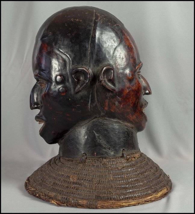 A fine and very life-like, life-size Janus head ceremonial helmet-mask from the cross-river region of Nigeria. The wood carved head is covered with animal skin which is stained and polished, accented with wooden teeth, and mounted on a fiber shoulder support. This mask has two similar but differentiated sides, one very dark and the other reddish brown. Both have flattened noses and open mouths. There are round plug protuberances next to each eye of each figure. The workmanship of this headdress is quite fine and displays better in person than in photographs. Here are some notes describing the construction and use of these masks”