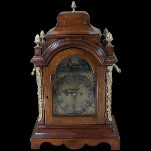English mahogany bracket clock, ca 1750. An 8-day movement bracket clock with brass and silvered dial signed Robert Higgs, London on the silvered dial / and again on the bright cut engraved brass back plate. In a mahogany case with four pine cone shaped ormolu mounts on the dome caddy top and figural herms on the front with a fifth finial on the top, brass carrying handles on the sides striking a bell once on the half hour and full bells on the hour, ticks and strikes; over the dial is an amusing painted figure of a man’s arm in movement with the ticking. With calendar aperture. With winding key.