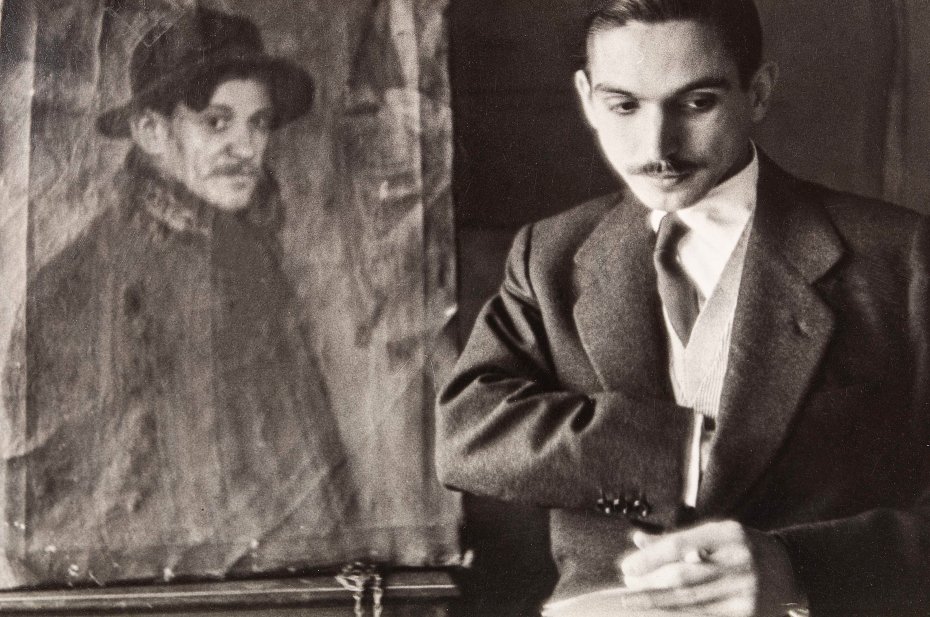 A “family portrait” photograph of Picasso’s nephew standing before an oil painting of Picasso. Black and white silver gelatin print. MAGNUM photo library print verso. Exhibited MacGill Gallery. A deeply psychological portrait of the painter Pablo Picasso as a young artist and his close look-alike nephew. Both men wear a similar mustache. We see the plainly dressed Picasso in the background and his smartly dressed nephew in the foreground. Picasso’s gaze is directed toward the viewer, while his nephew looks away, preoccupied. This family portrait invites us to consider the family resemblance and the difference in personality.