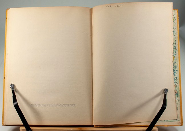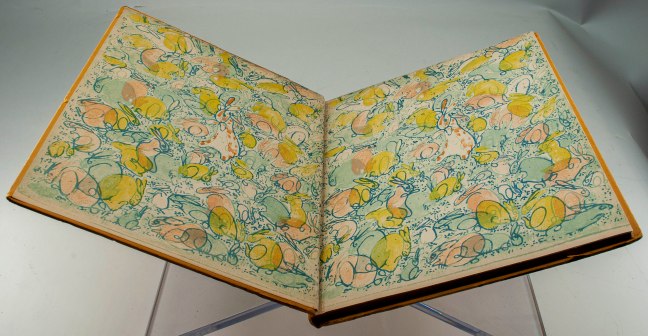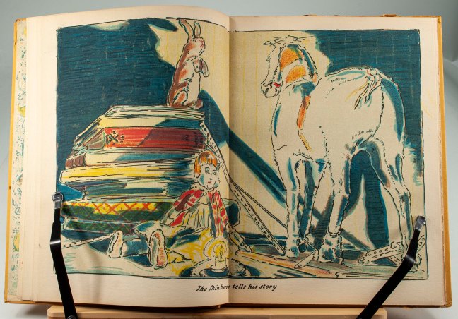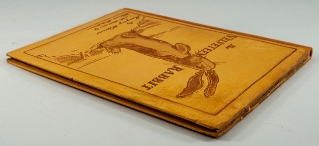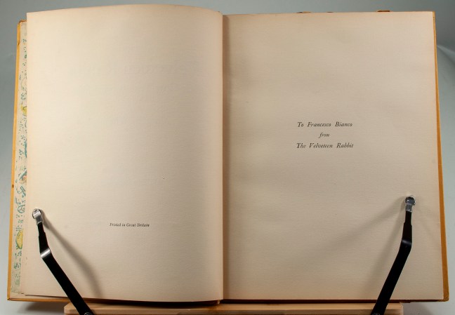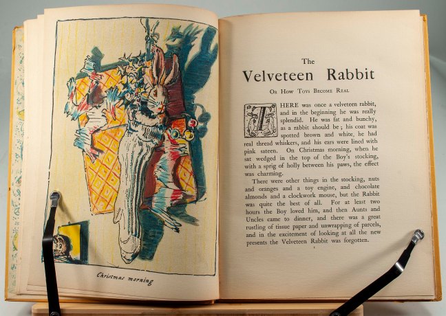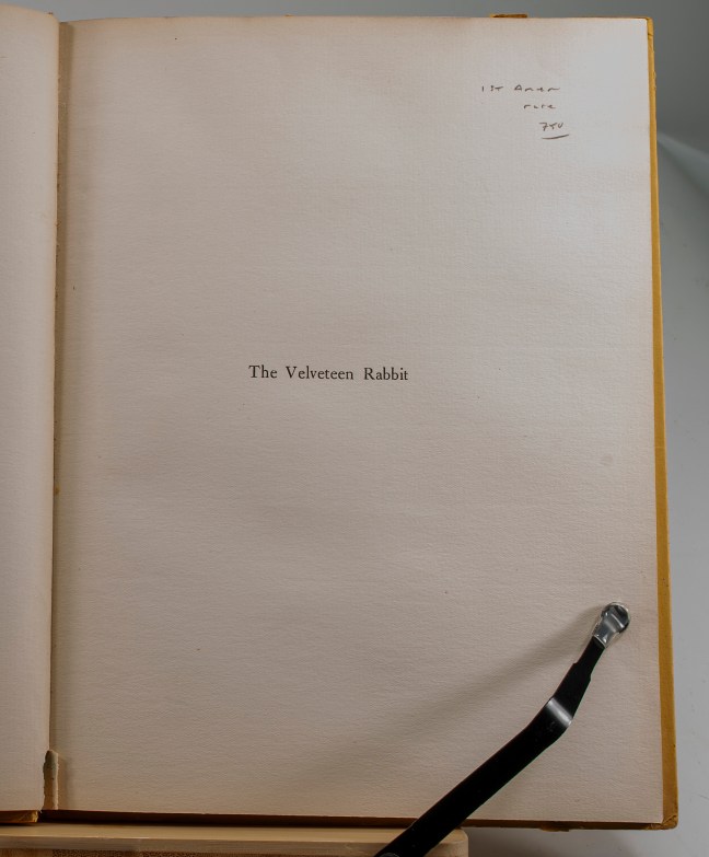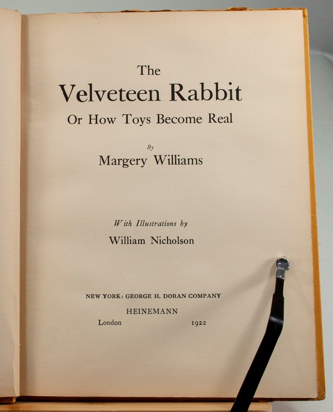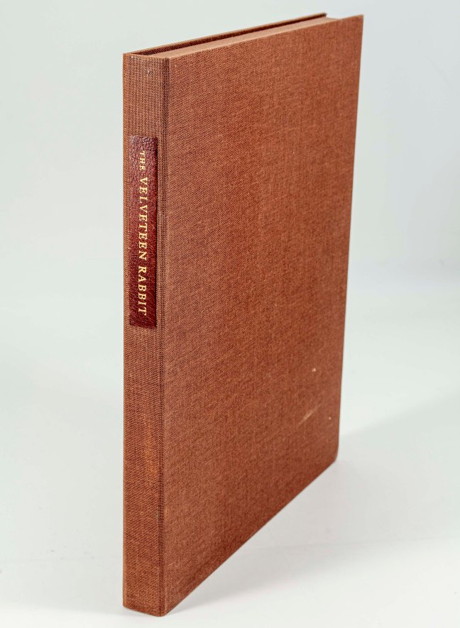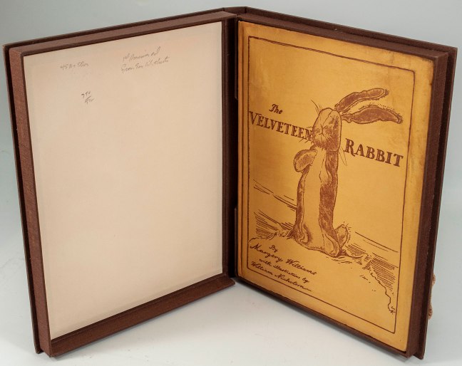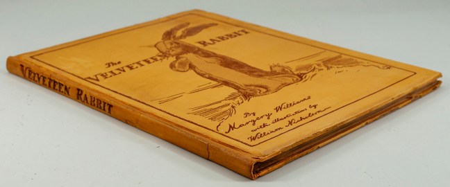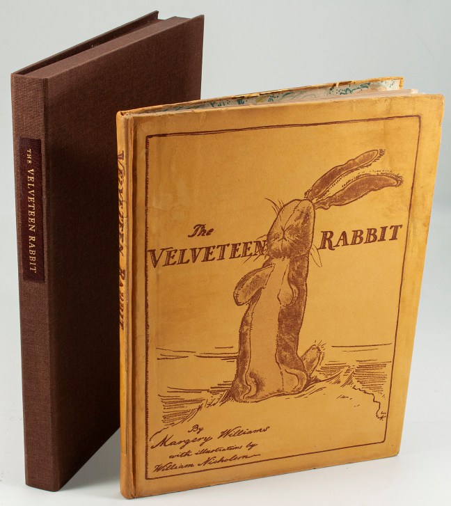 A rare copy in fine condition of the first edition of the children’s classic “The Velveteen Rabbit”, by Margery Williams, illustrated by William Nicholson. The paper covered boards with Nicholson’s illustrations to the covers. The pictorial endpapers are a colorful riot of many, many bunnies. There are 19 pages of text, four full-page color illustrations, and three double-page illustrations. The illustrations and the text are bright. This first edition is the American issue, printed in Great Britain with English sheets, with Whitefriar’s Press annotation on verso of last page. Published in 1922 by George H. Doran (New York) and Heinemann (London). Quarto, 9 ½ by 7 ¼ .The author Margery Williams Bianco was born in London, and at the age of seven, moved with her family to the United States. The yellow paper-covered boards have a bit of rubbing and chipping along the top and bottom edges. There is no dust jacket. The book is protected by a custom brown cloth-covered clamshell case. There are no bookplates, no tears, no foxing. The hinges are sound and the binding is tight. This is a rare book in fine condition. The only markings are small pencil notations by a previous bookseller.